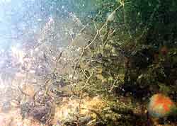 藻場造成方法は? 護岸が概成した一九八八年十二月から一九九〇年十二月にかけて、緩傾斜石積護岸の四地点に、魚介類の産卵場、幼稚仔魚の保育場としての機能をもつホンダワラ類の単年生海藻であるアカモク、シダモクと多年生のヤツマタモクを、サザエやアワビなどの藻食性動物の餌場としての機能をもつ単年生海藻であるワカメと多年生海藻のカジメ、クロメの合計六種を選定し、移植を行いました。海藻は主に春と秋に成熟するため、年間を通して安定した藻場が形成されるよう成熟時期の異なる海藻のうち、周辺海域で分布が確認されている種を選定しました。(図―1) 種苗の移植は、種苗網を護岸に直接固定する方法と種苗網または種ロープを表面に取りつけたコンクリートブロック(藻礁ブロック)を設置する方法の二パターンで行いました。 藻場造成による効果は? 種苗を移植した後、毎年、観察調査を行ってきた結果、一期空港島の護岸には海藻の生育に必要な光が到達する水深十mあたりまで海藻が繁茂しており、その海藻着生面積は約二十三haにも及ぶことがわかっています。藻場の遷移をみると、一九八九年当初はアオサ場、一九九一年にはガラモ場が主体でしたが、一九九二年頃からテングサ場や海中林が広がり、一九九六年以降では海中林が主体となって変遷していることがわかっています。 これまでに観察された海藻は合計六十三種類あり、移植した海藻や天然の流れ藻から放出される胞子が着底し、世代交代を繰り返すことによって藻場は形成されています。 周年繁茂している海藻は、主に種苗移植由来のカジメ、クロメと天然供給も加わったワカメ、シダモクであり、その他にも天然の流れ藻によって繁茂したタマハハキモクが、ワカメやシダモクと同様、冬から春に繁茂する季節変化を繰り返し、安定した藻場を形成しています。 移植した海藻の広がり方は? 種苗移植を行った海藻のうち、カジメ・クロメ(以下、カジメ属)は、現在では空港島の藻場を代表する種となっています。カジメ属は移植地点を中心に繁茂し、緩傾斜石積護岸全域に分布していったことがわかります。(図―2) Aw護岸では被度五%以上が五一一m/年、五十%以上が四八一m/年とほとんど変わりがなく、As護岸では被度五%以上が二一七m/年、五十%以上が六十五m/年、またB護岸では被度五%以上が一一〇m/年で拡大しており、潮通しのよい沖側Aw護岸での拡大速度が高いことがわかりました。 藻礁ブロックの形状は? 藻礁ブロックは、A型、B型、C型を考案し、さらにC型については三タイプを考案しました。いずれも基盤の上面は泥が溜まらないように屋根型とし、種糸等の固定では波浪で摩耗しないように基盤表面に埋設された軟質材にステープルを用いて打ち付ける工夫を施しました。A型基盤は、緩傾斜石積護岸の傾斜部に設置するため、高さは五十cm以下としました。B型基盤は、波の穏やかな沿岸側の護岸水平部に設置するため、藻礁だけでなく、魚礁としても機能するように基盤の下部は中空としました。C型基盤は、波浪条件の厳しい沖側でも安定性を確保できるよう重さに配慮しました。穴を好む魚介類のためにC1型基盤には横穴(貫通)を、C2型基盤には縦穴(貫通)を設けました。C3型基盤の側面にはイセエビ用に行き止まりの横穴を設けて泥が溜まらないように僅かに下向きにし、基盤の上面は渦流で種苗が滞留しやすいように階段状に工夫しました。(図―3) 藻礁ブロックの形状と海藻の付着位置との関係は? C型ブロック上のカジメの付着部分とその全長について調べたところ、ブロックの型による付着個体数の差はほとんどみられませんでしたが、大型個体に着目すると、C1型基盤に比べて形状に凹凸があるC2及びC3型基盤の方が多く付着しており、側面には少なく、上面の角、溝、穴の部分でよく付着していました。このことから、波の影響を受ける場所では、凹凸が多い付着基盤の方が大型個体の生残に効果があるといえます。 観察される魚介類は?  | | 図―4 流れ藻とメバル稚魚の移動・分散経路 | これまでに空港島周辺海域で観察された魚介類は合計一四一種類であり、空港島が造成される前の砂泥底には生息していなかった多くの魚介類が観察されています。特に、岩礁性のアイナメ、カサゴ、メバルなどは季節に関係なく継続して観察されており、空港島周辺に定着しているものと考えられます。それ以外にもスズメダイ、イシダイ、クロダイ、サザエ、ウニ、ナマコ、タコ等の多種多様な魚介類が観察されています。 最近の調査結果では、一期空港島護岸で繁茂していた海藻が、流れ藻となって大阪湾全域に漂流しており、これら流れ藻にくっついて約六十万匹以上のメバルが大阪湾に広がっていることがわかっており、空港島護岸に造成された藻場は、大阪湾の環境に水産資源の供給源として貢献していることがわかっています。(図―4) 今後の取り組みは? 二期空港島護岸においても、一期空港島と同等もしくはそれ以上