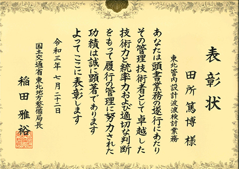 一般財団法人 沿岸技術研究センターは国土交通省 東北地方整備局から優良業務表彰と優秀技術者表彰を受けましたのでお知らせします。